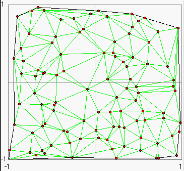 Zur Visualisierung dieser Werte (als kontinuierliche Funktion) kann die XY-Ebene, basierend auf den Punktkoordinaten, mittels DELAUNAY Triangulation in Dreiecke zerlegt werden: