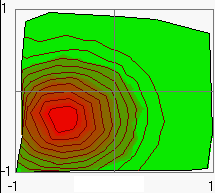 Setzen Sie den Mauszeiger auf das Intensitätsmaximum im 2D-Bild, dann können Sie den Maximalert und dessen Koordinaten abschätzen (Wertanzeige in der Statuszeile, Wahre Werte: x = -0.5, y = -0.33, F = 100).